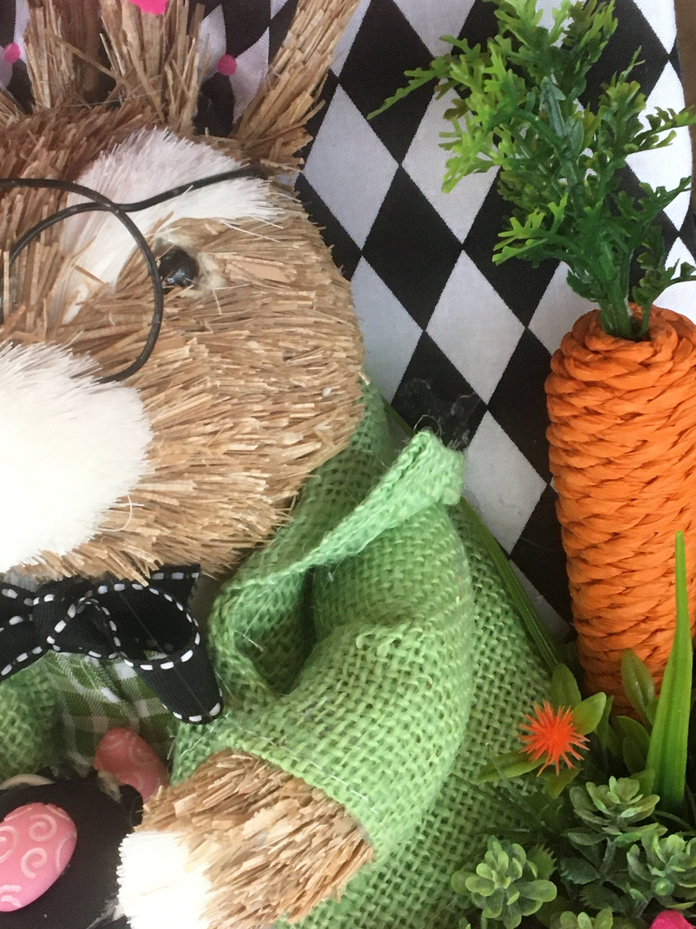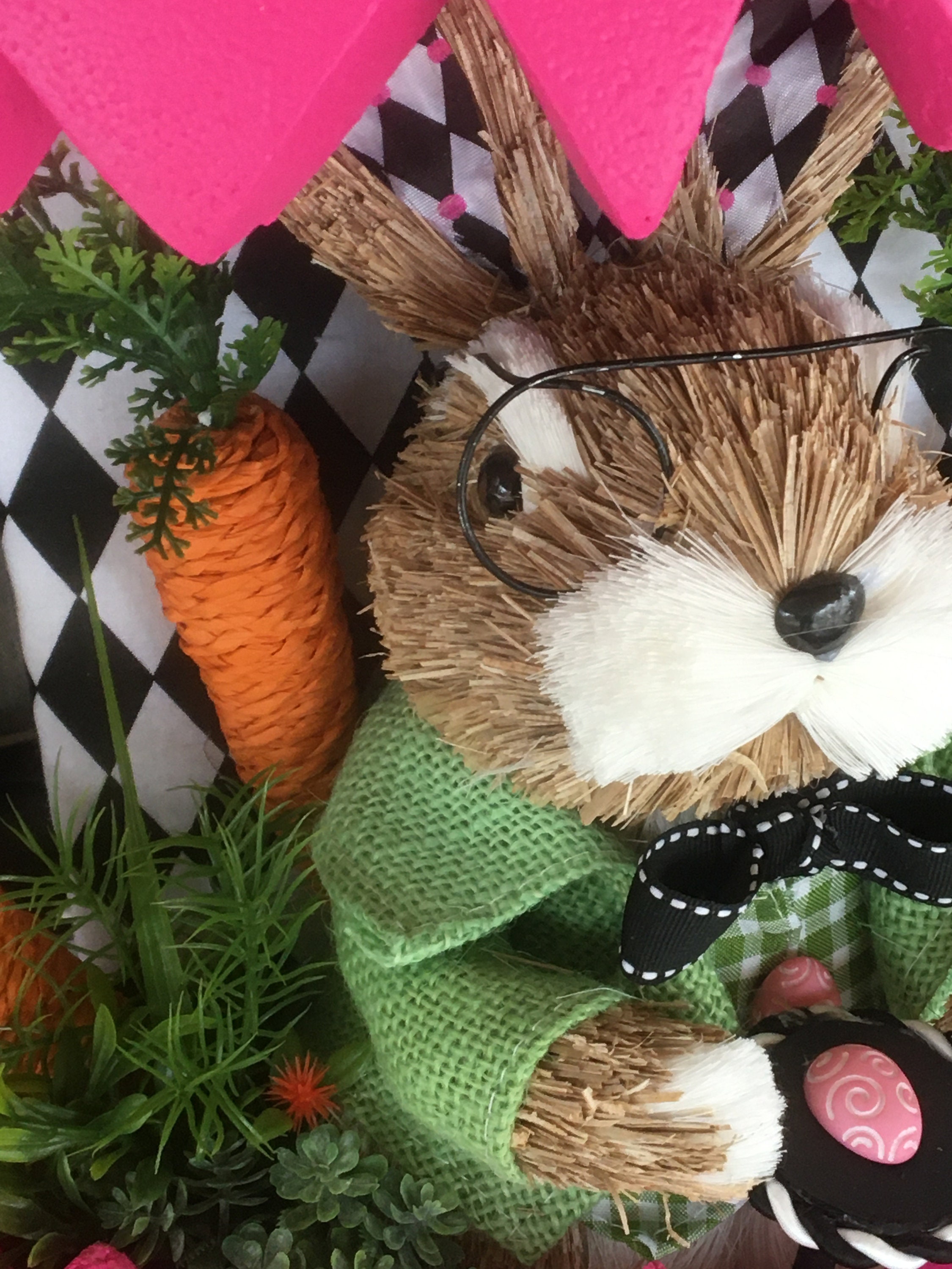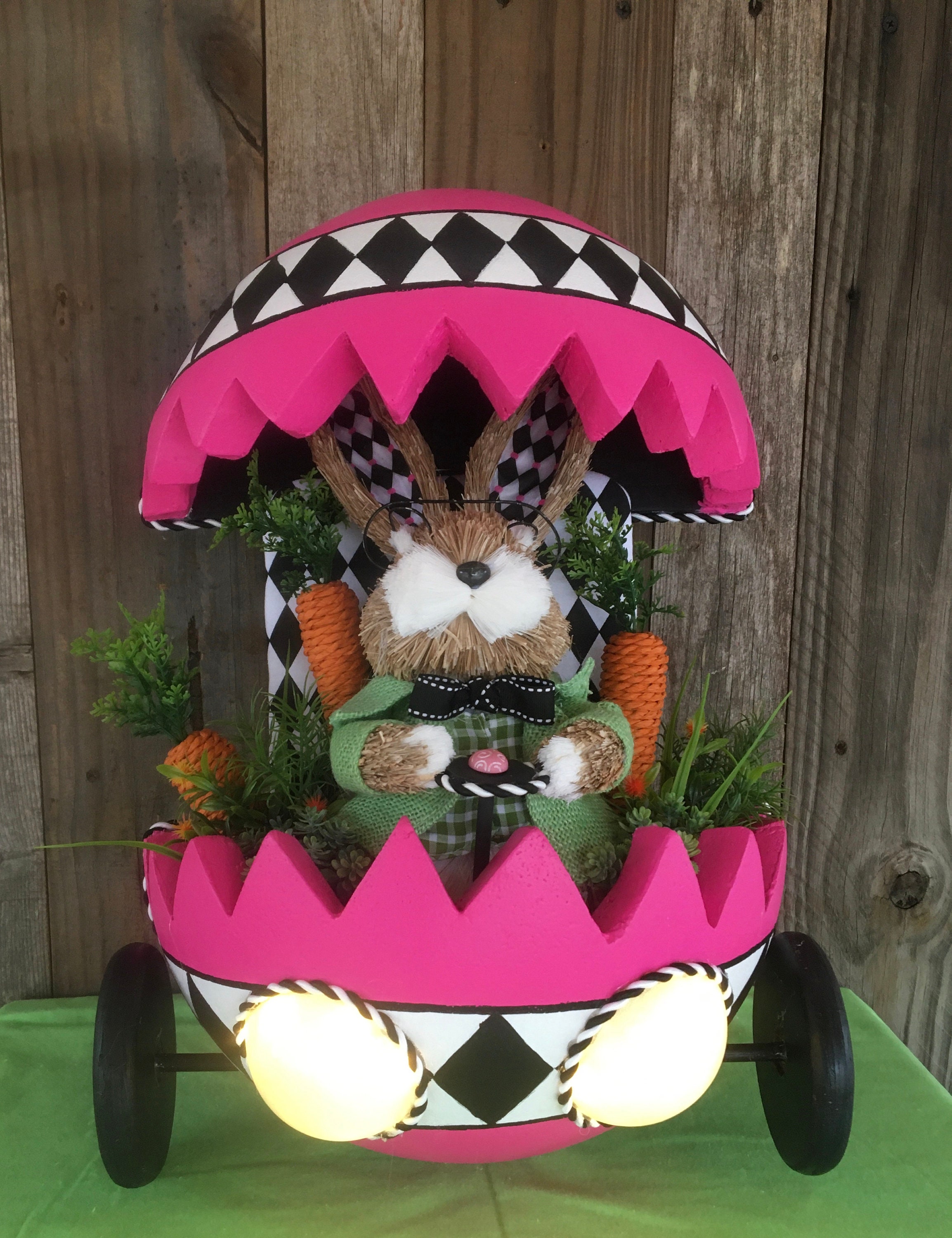 Vroom Vroom Easter and spring is on the way . This over the top wreath attachment bunny car shaped like a cracked egg with battery operated headlights, hot pink with harlequin pattern , bunny carrying his carrots will be the perfect attachment for your spring or Easter designs. Measures 20 inches tall 13 inches wide and 7 inches thick . Easily attaches to wreath. This design is from pattern and tutorial from Petals and Plumes members only group.