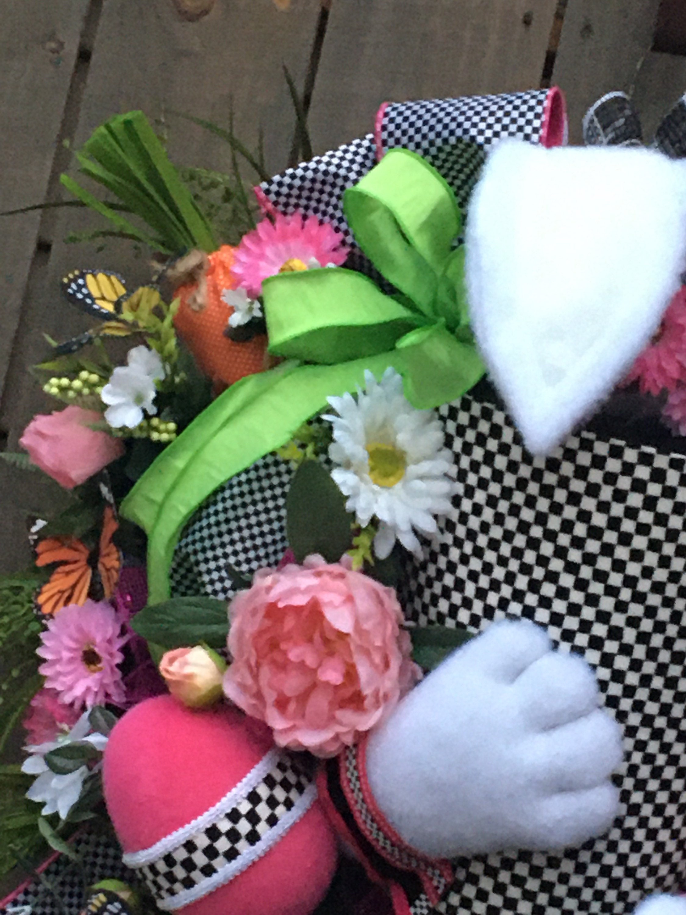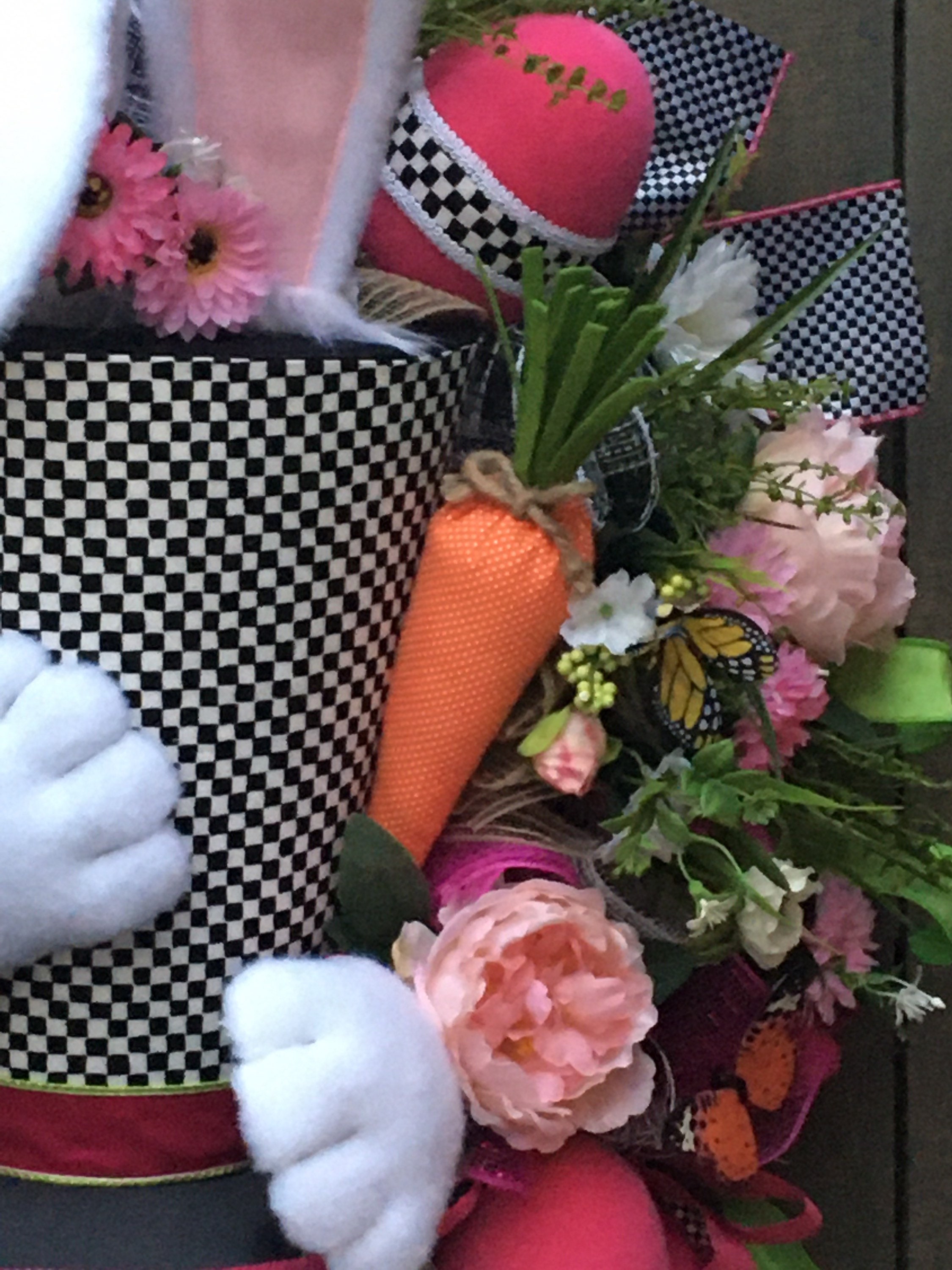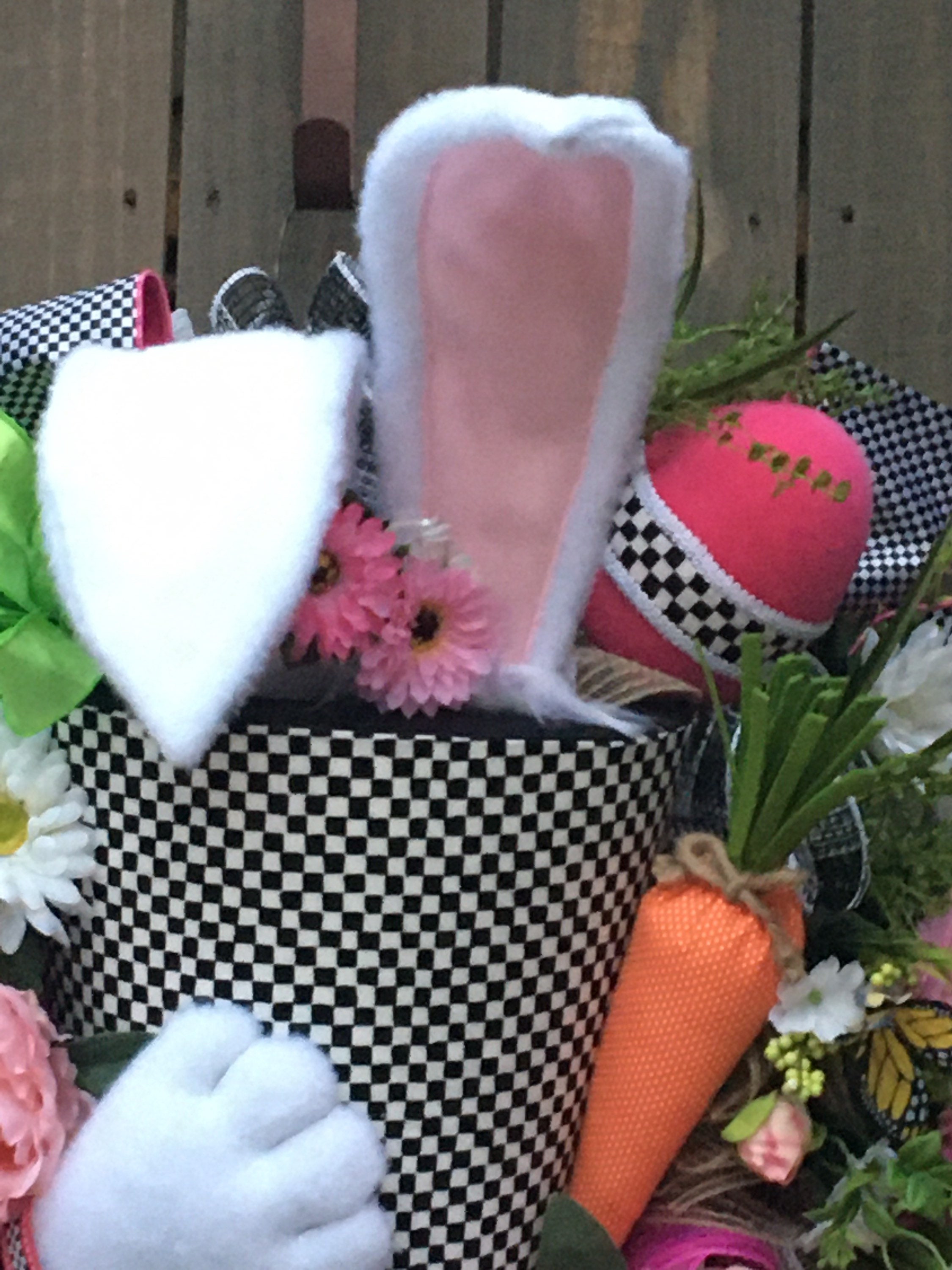Peek a boo I am hiding out in the garden until Easter. This large bunny is hiding out under his large black and white checkered hat with large whimsical ears and furry feet , surrounded by spring foliage and florals . Butterflies flying around the carrot patch. Hot pink flocked Easter eggs .Premium ribbons throughout the wreath . This large bunny wreath measures 34 inches tall and 27 inches wide and 13 inches thick. Ready to ship . The Bunny attachment is from pattern and tutorial from Petals and Plumes members only group.