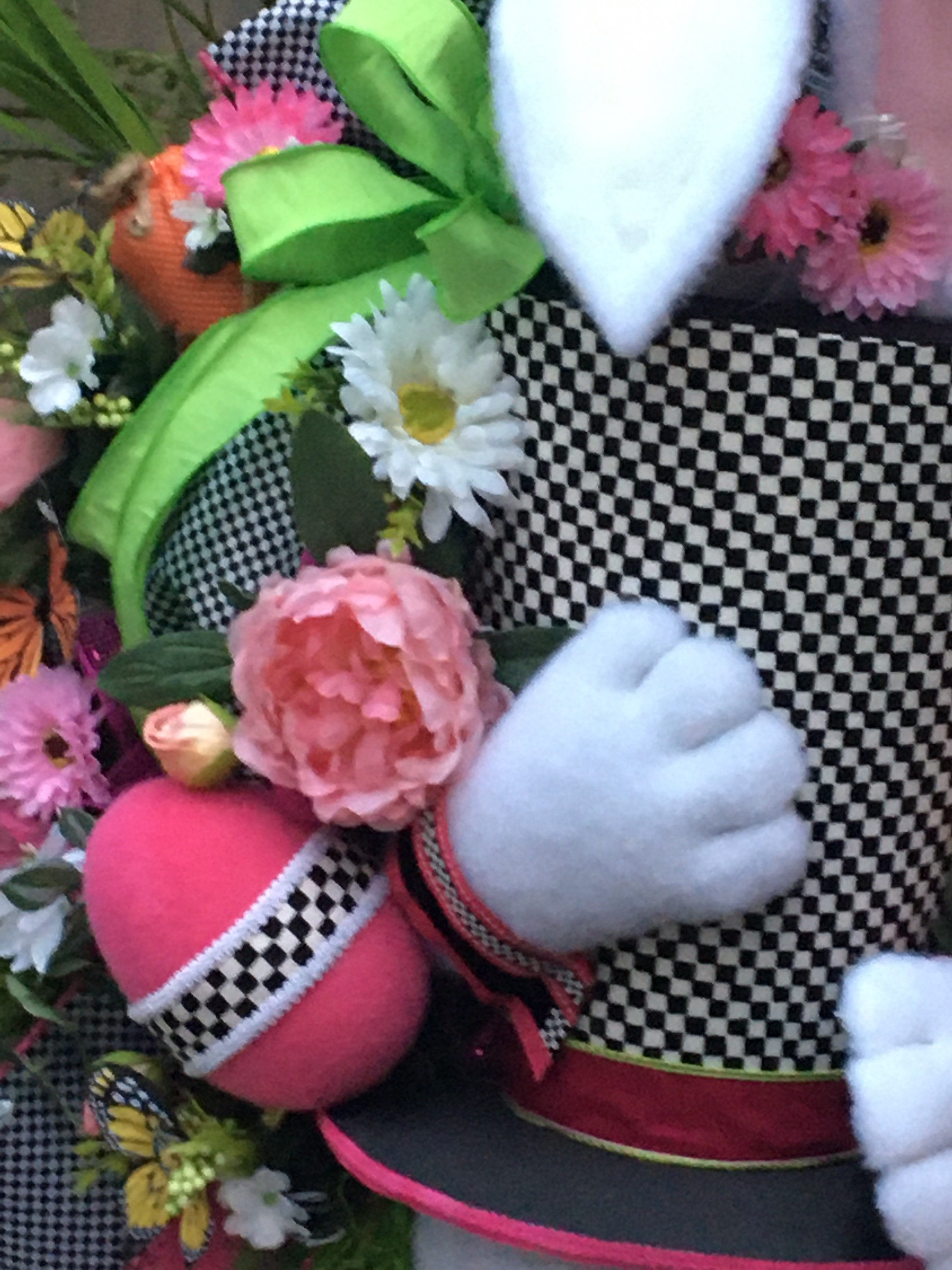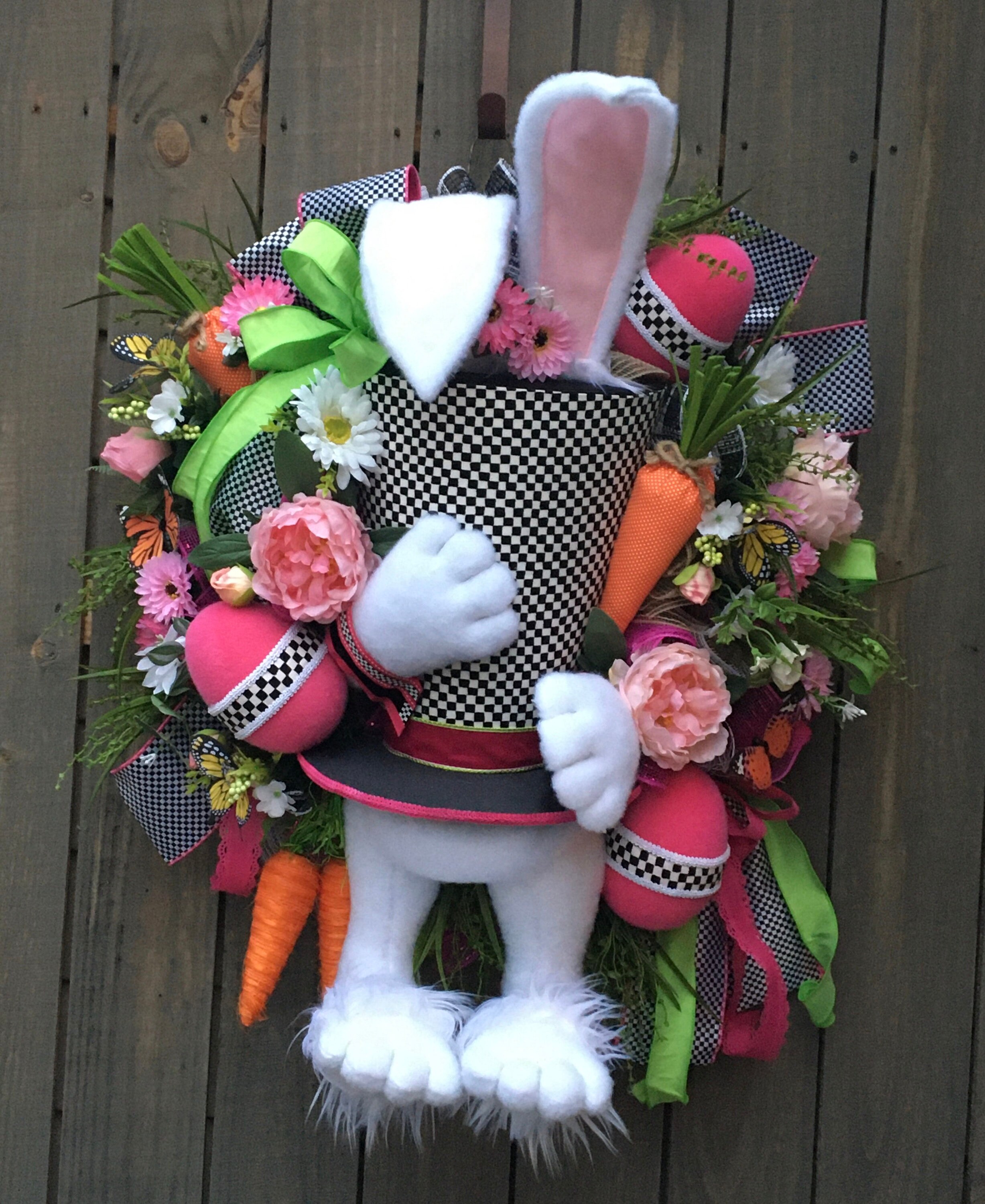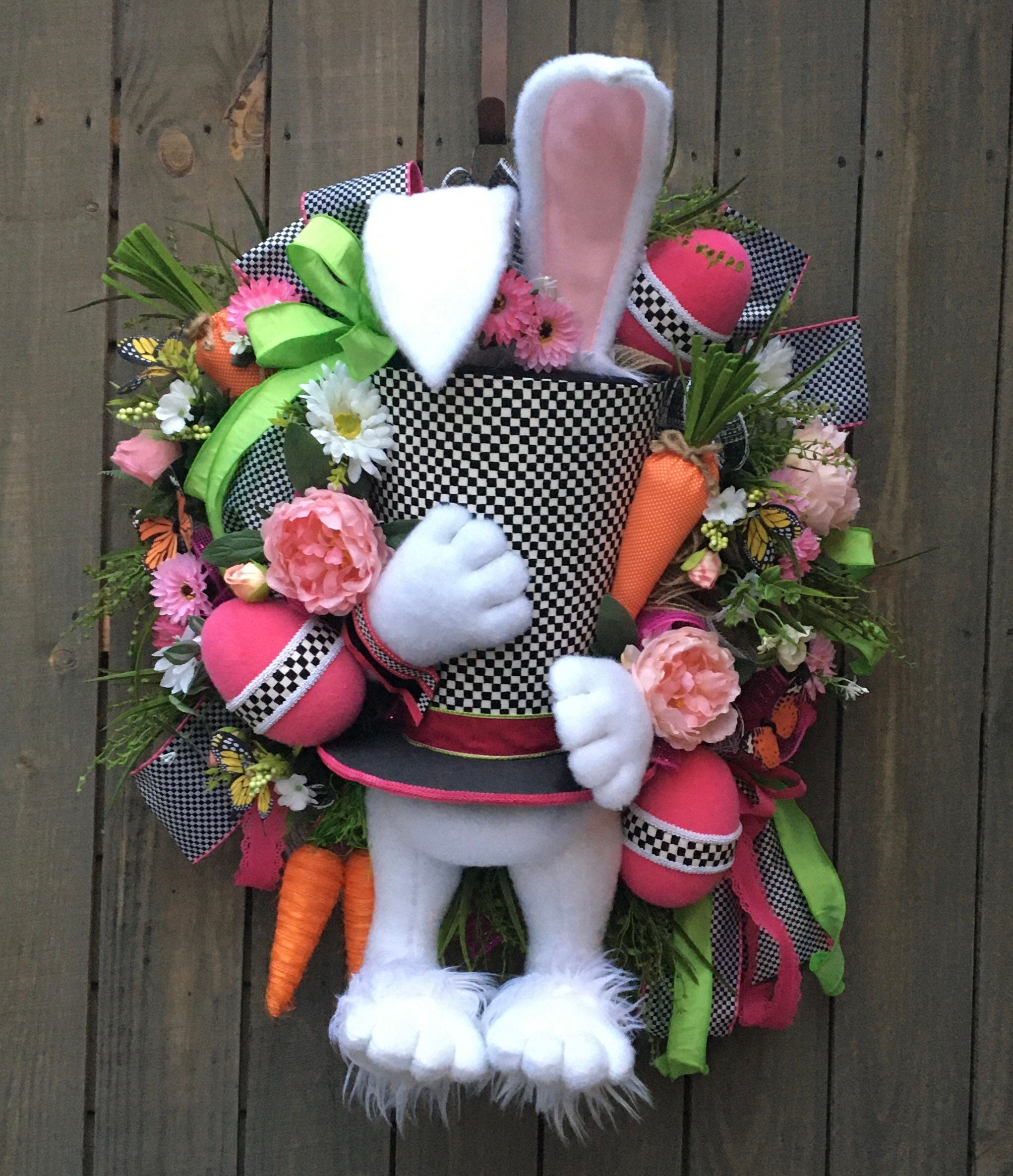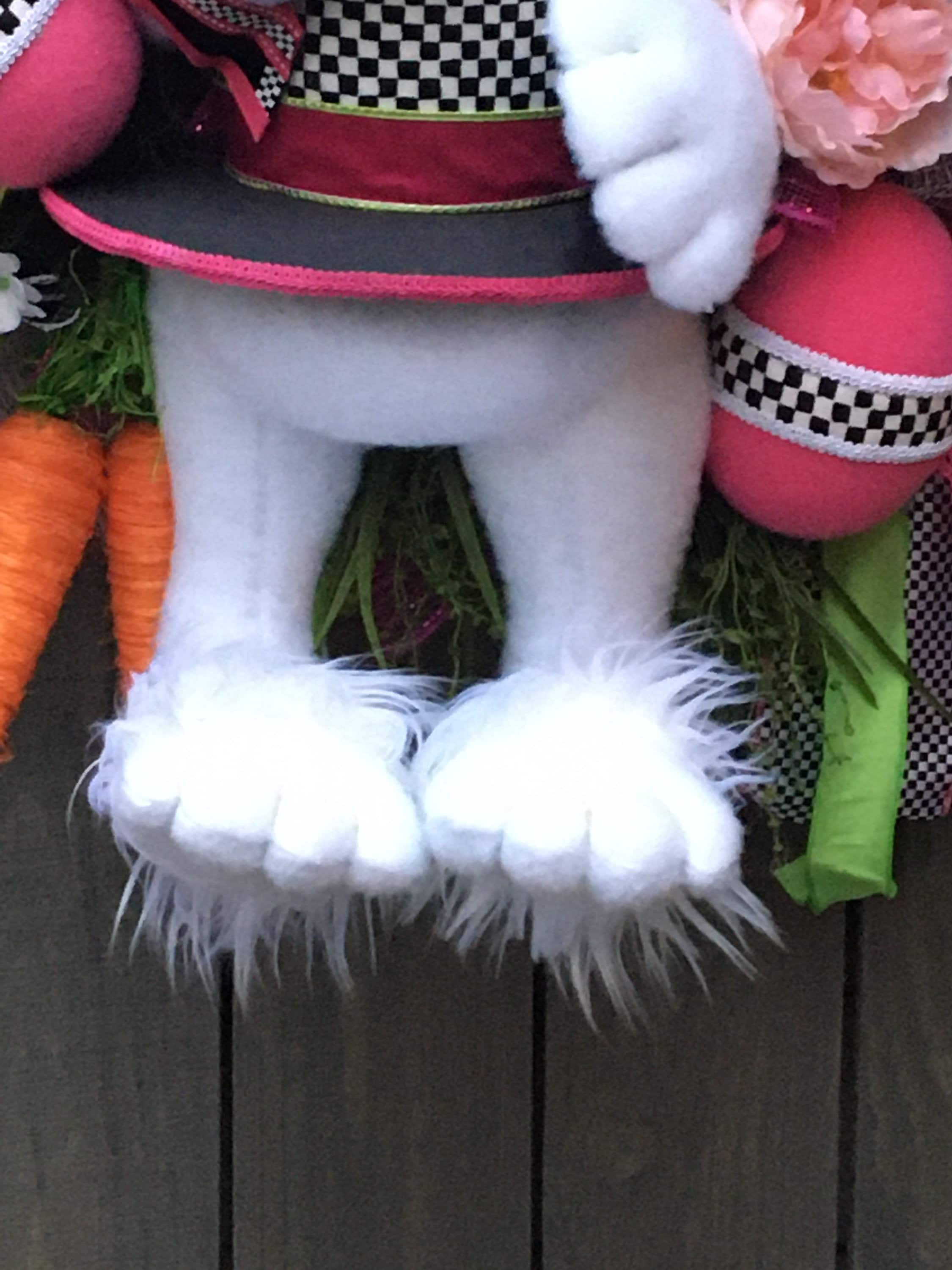 Peek a boo I am hiding out in the garden until Easter. This large bunny is hiding out under his large black and white checkered hat with large whimsical ears and furry feet , surrounded by spring foliage and florals . Butterflies flying around the carrot patch. Hot pink flocked Easter eggs .Premium ribbons throughout the wreath . This large bunny wreath measures 34 inches tall and 27 inches wide and 13 inches thick. Ready to ship . The Bunny attachment is from pattern and tutorial from Petals and Plumes members only group.