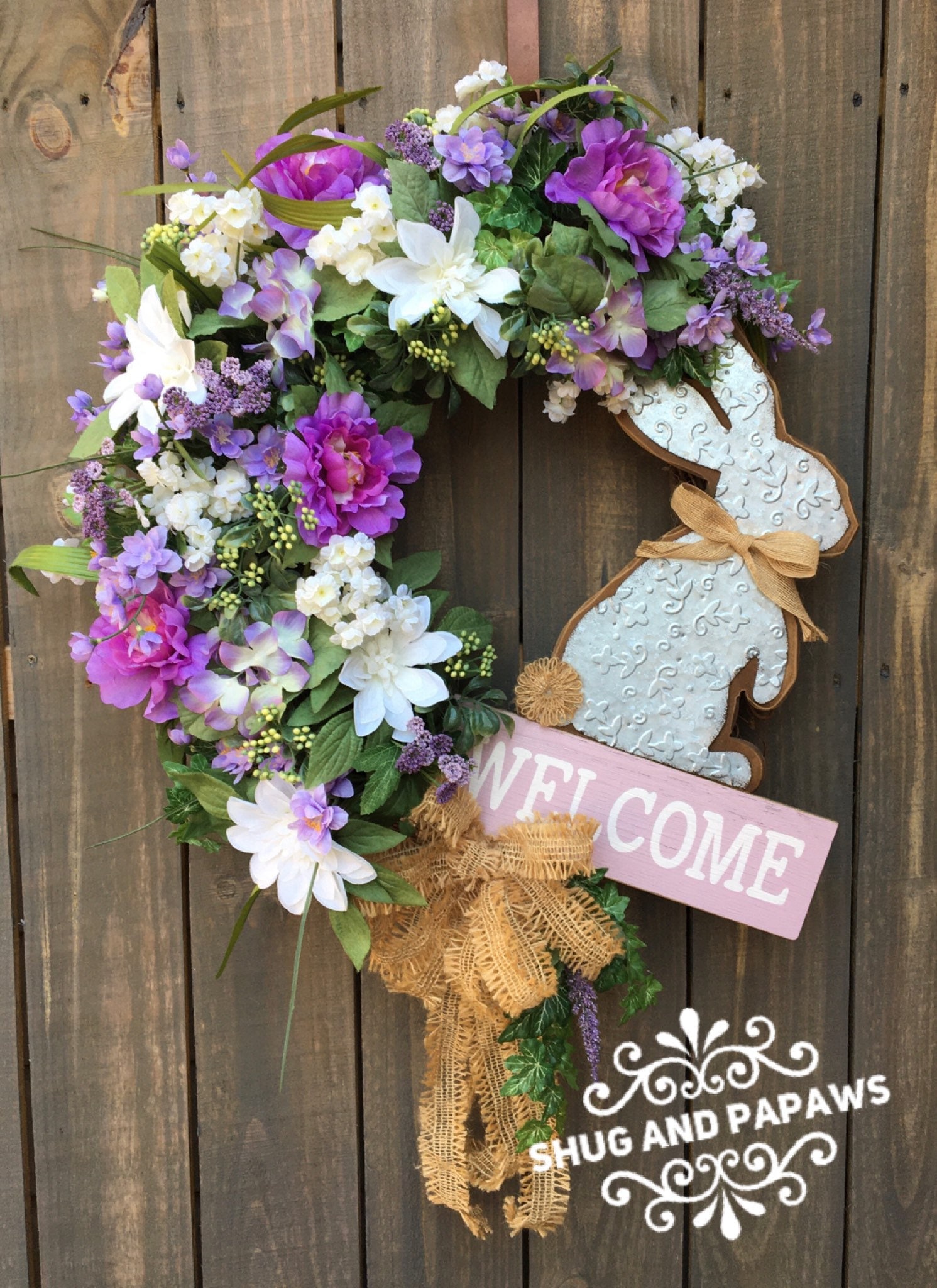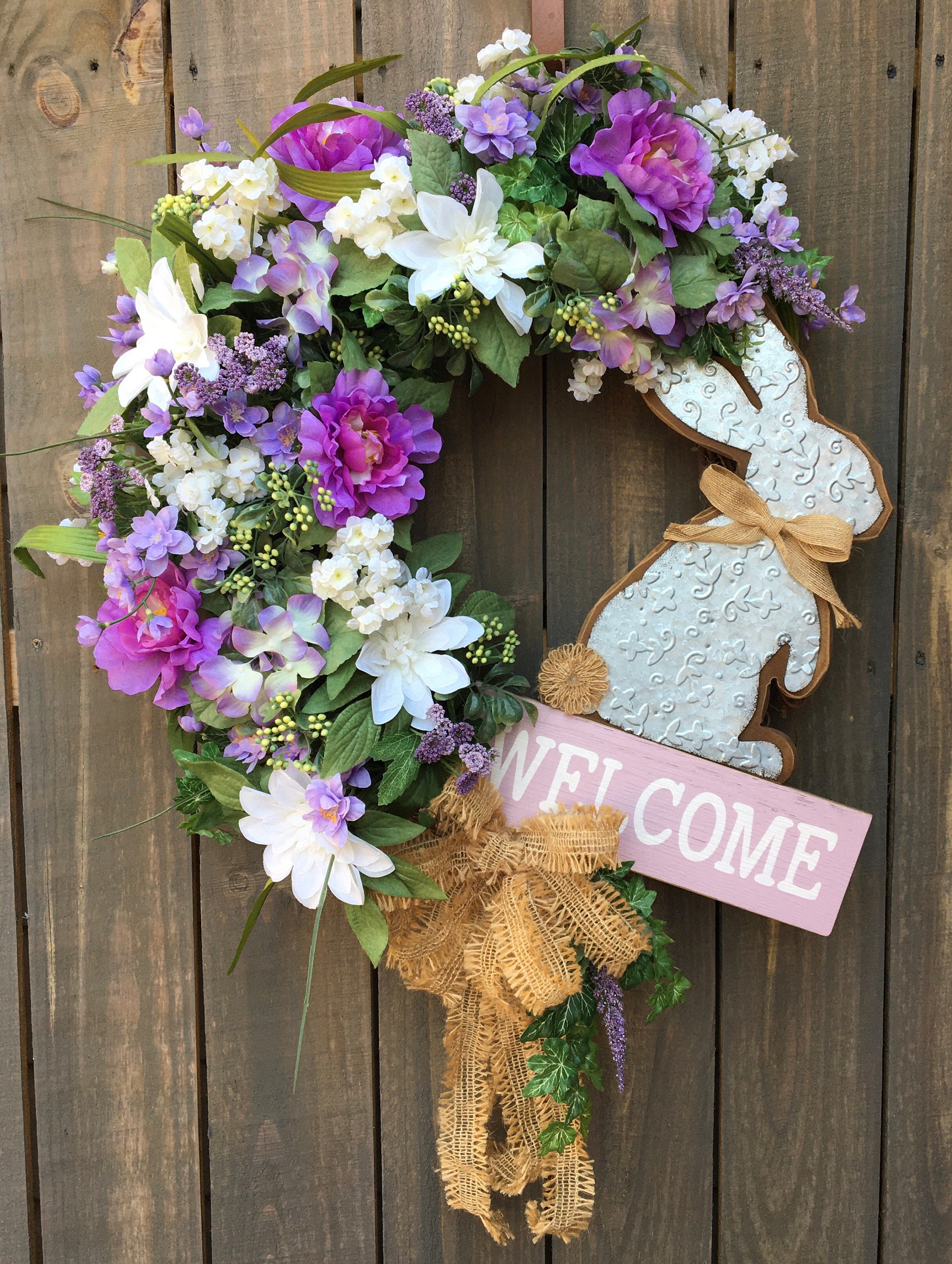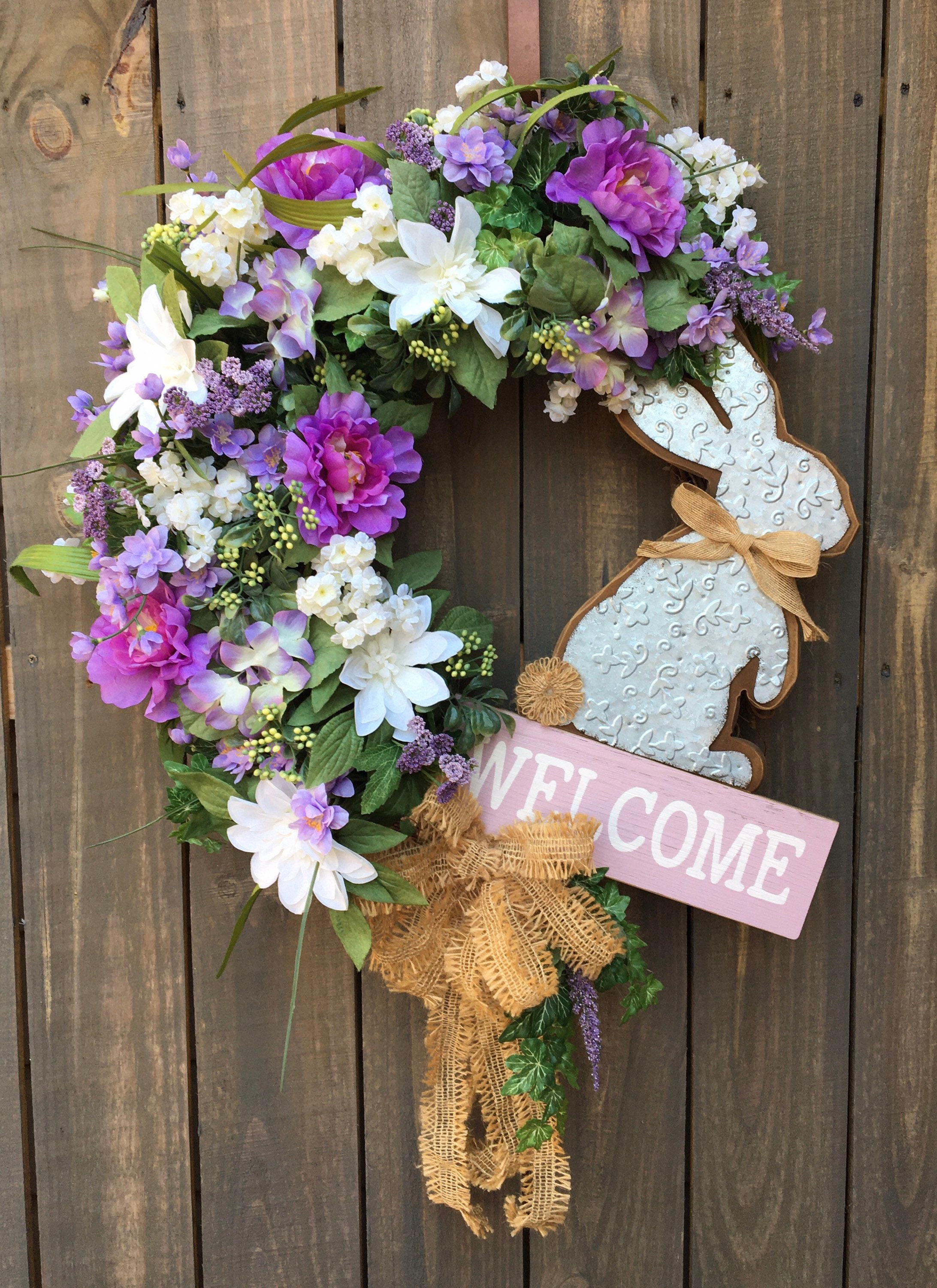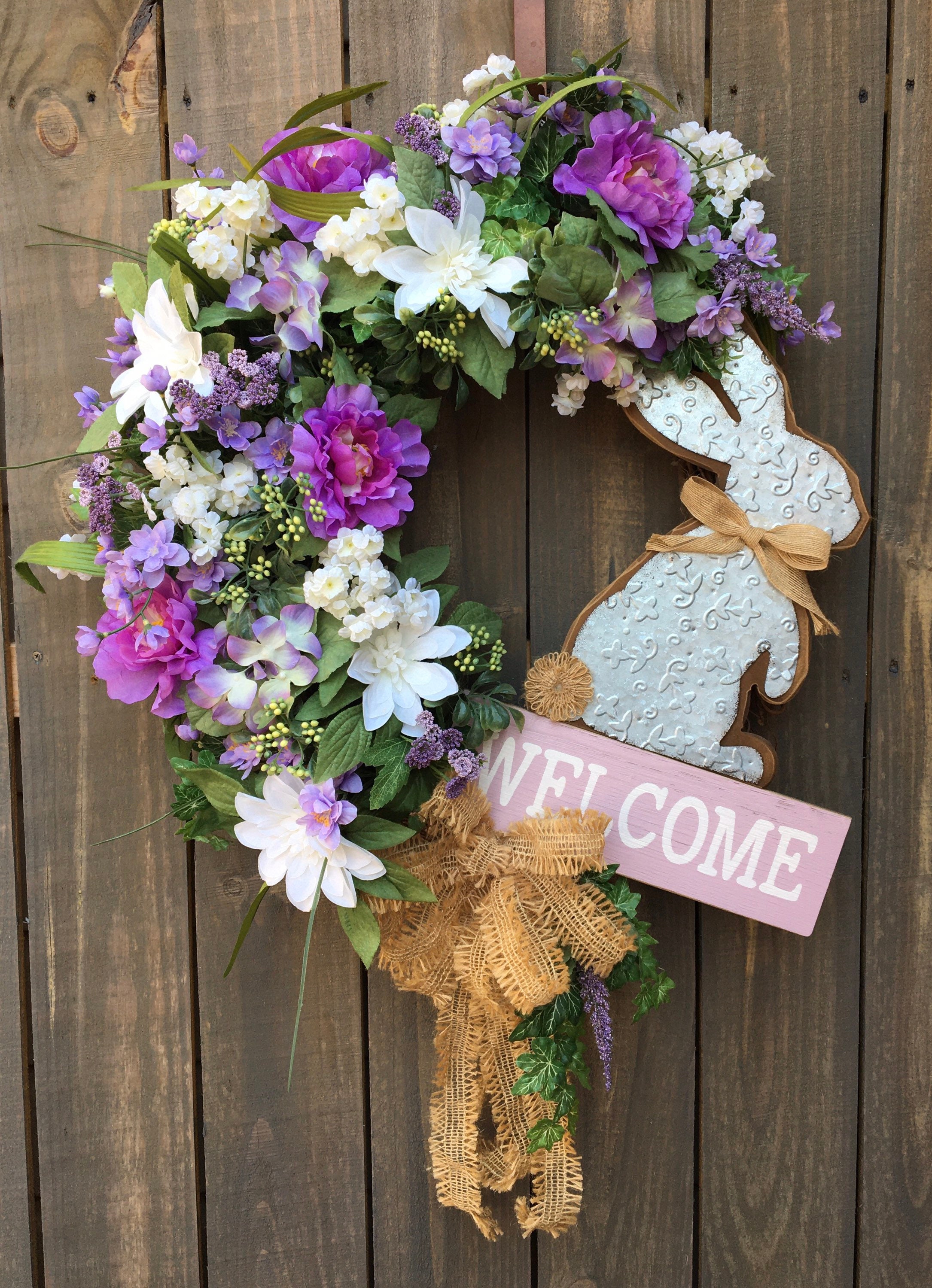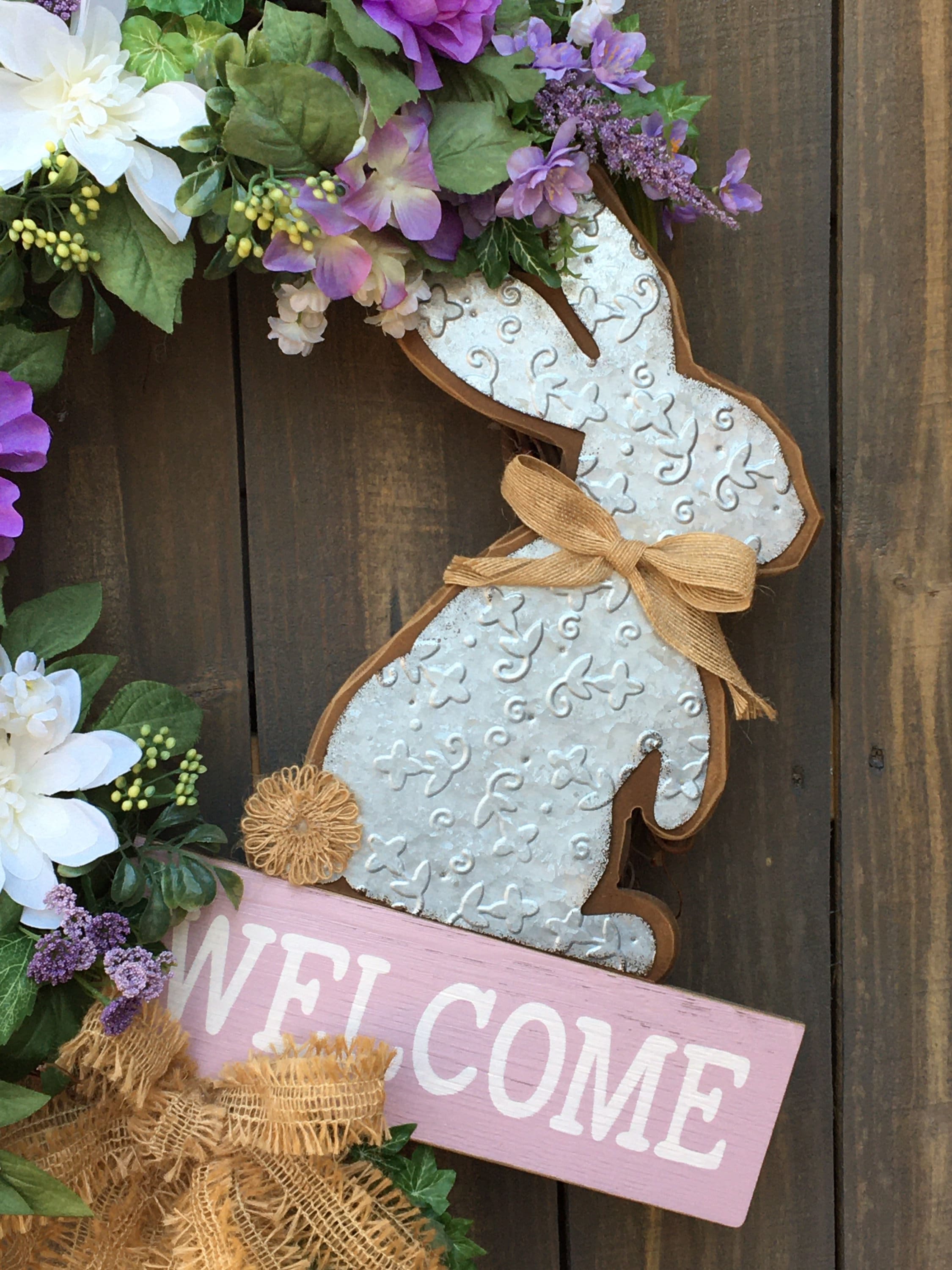 Easter bunny wreath with rustic galvanized Easter Bunny and lavender Welcome sign .