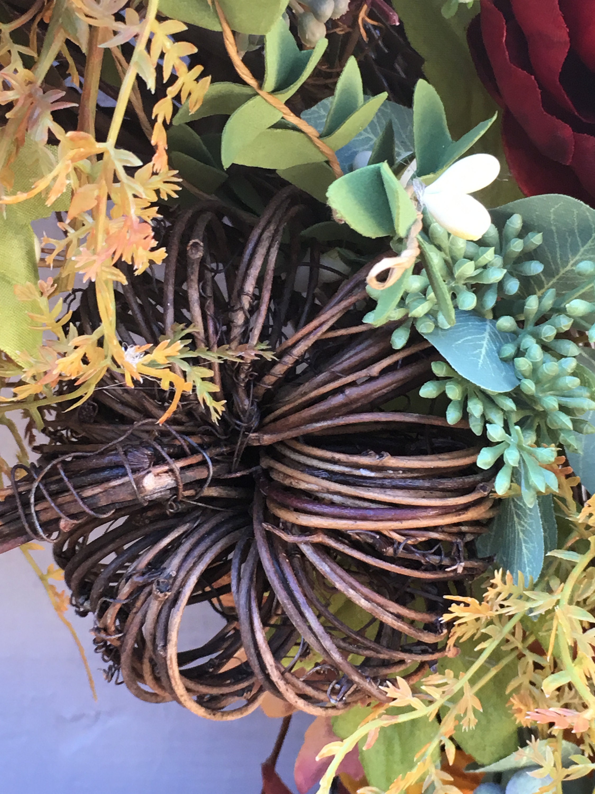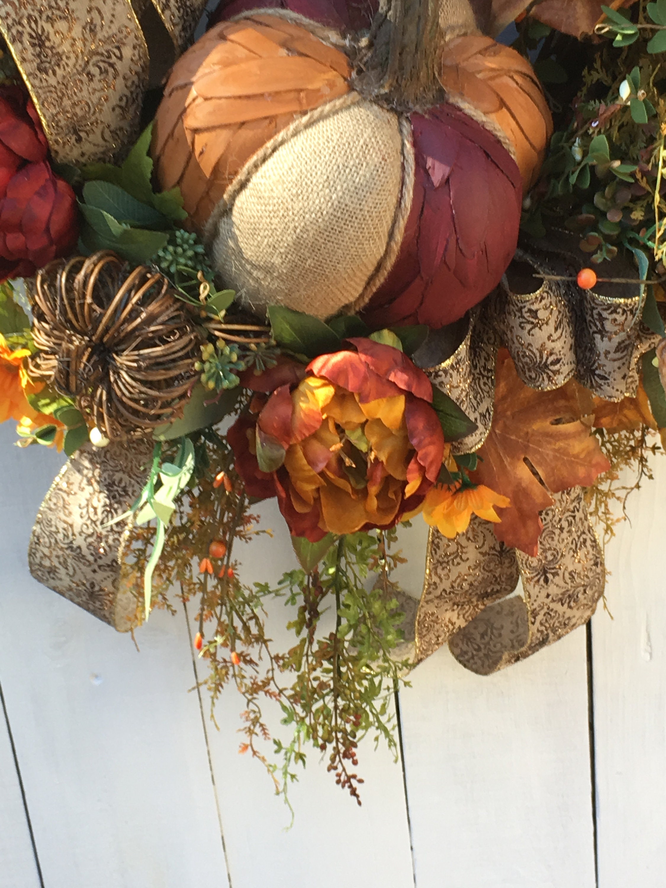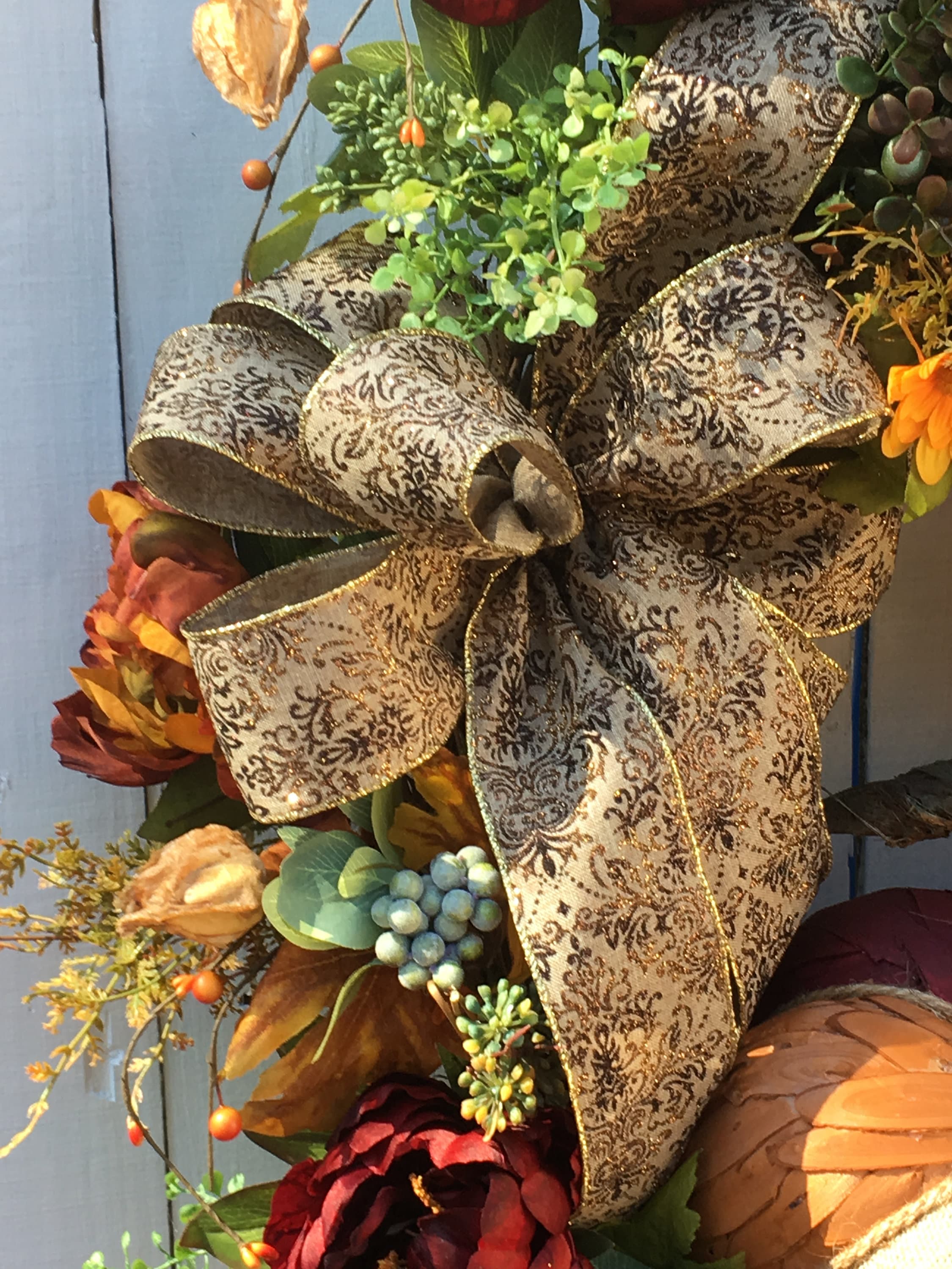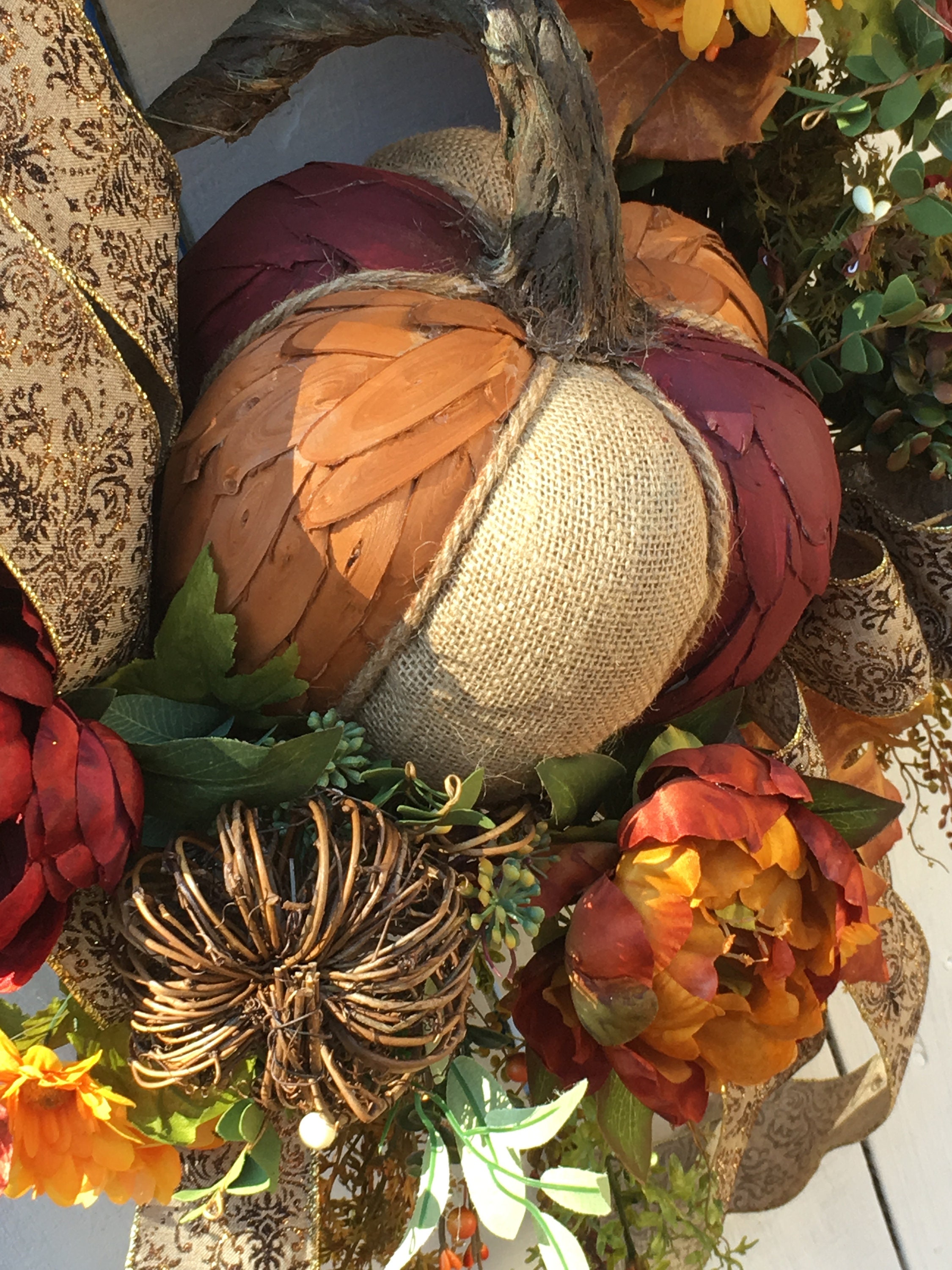 Beautiful for your Fall Decor ,Perfect for Thanksgiving .Elegant Autumn .Who is ready for the phenomenon of Autumn , when the leaves change and have so many hues of red, yellow, orange ,gold, burgandy,purple , magenta, brown , pale and dark shades of green .This Wreath has all of this and more .A 7 inch by 7 inch burlap and wood chip faux pumpkin in the center with grapevine pumpkins adorning this gorgeous wreath. Built on an eightteen inch grapevine wreath form this completed wreath measures 24 inches wide 9 inches deep and 26 inches in height , with ribbon tails extending 12 inches below the wreath . Thank you for visiting our shop .