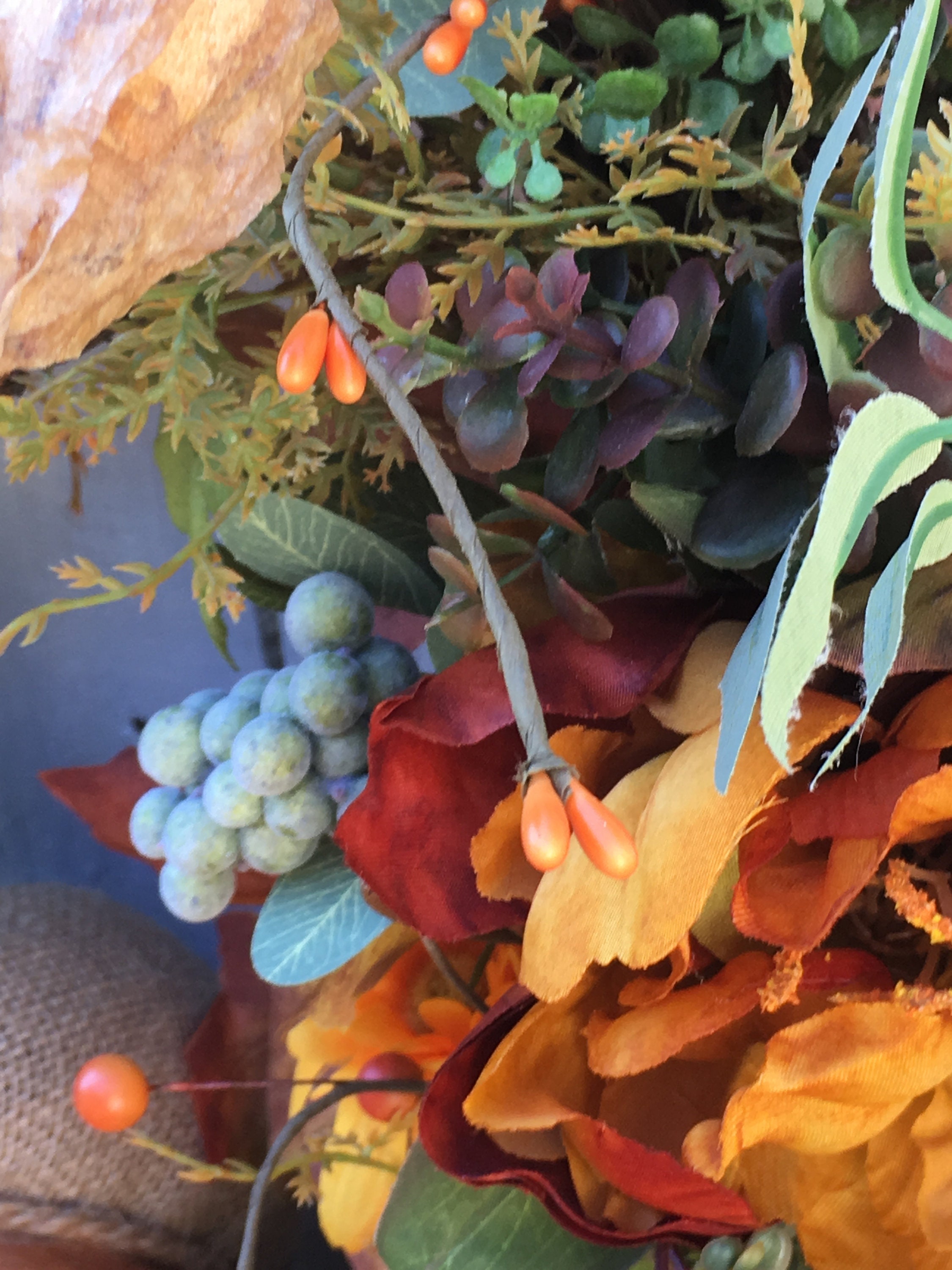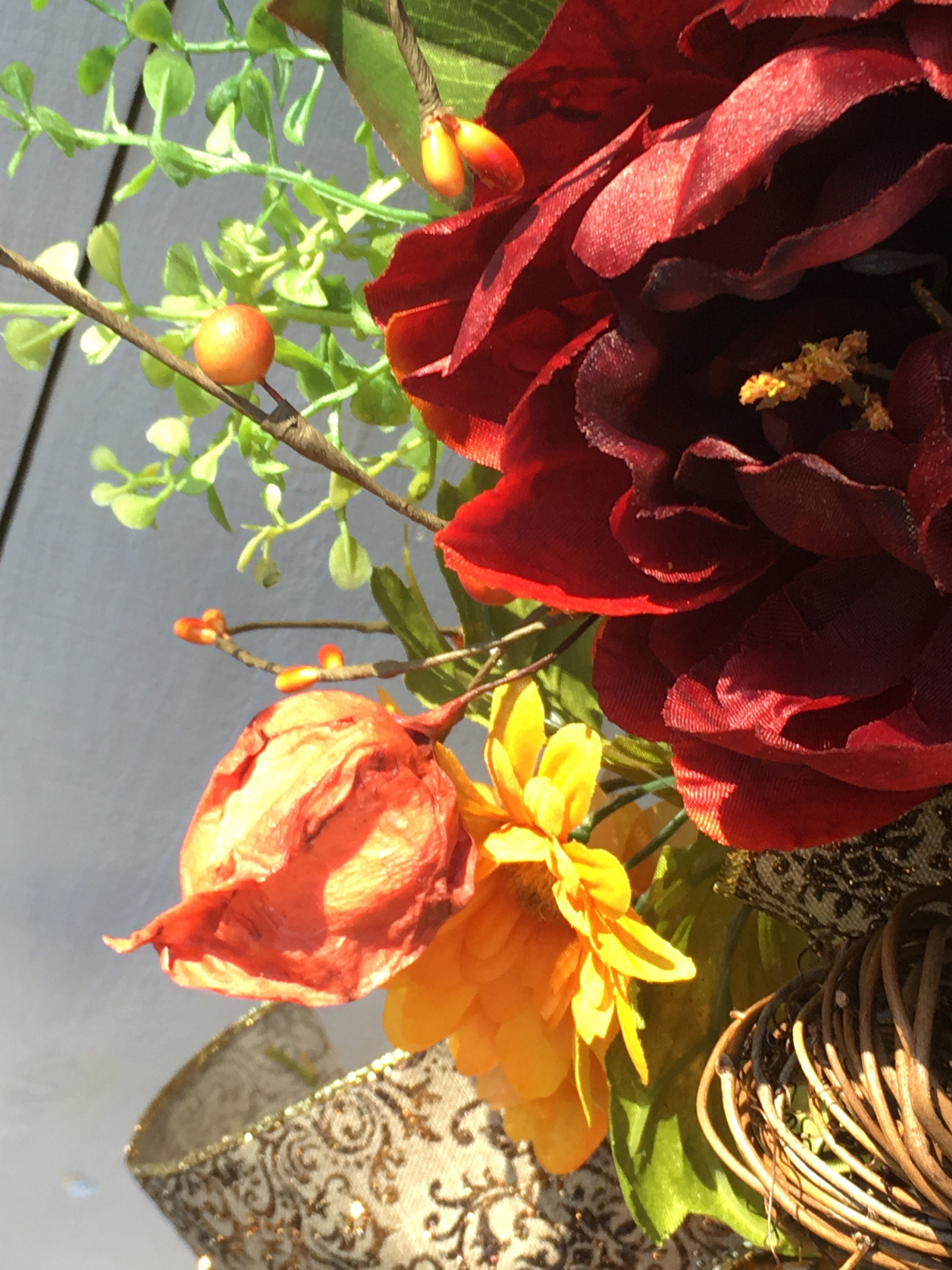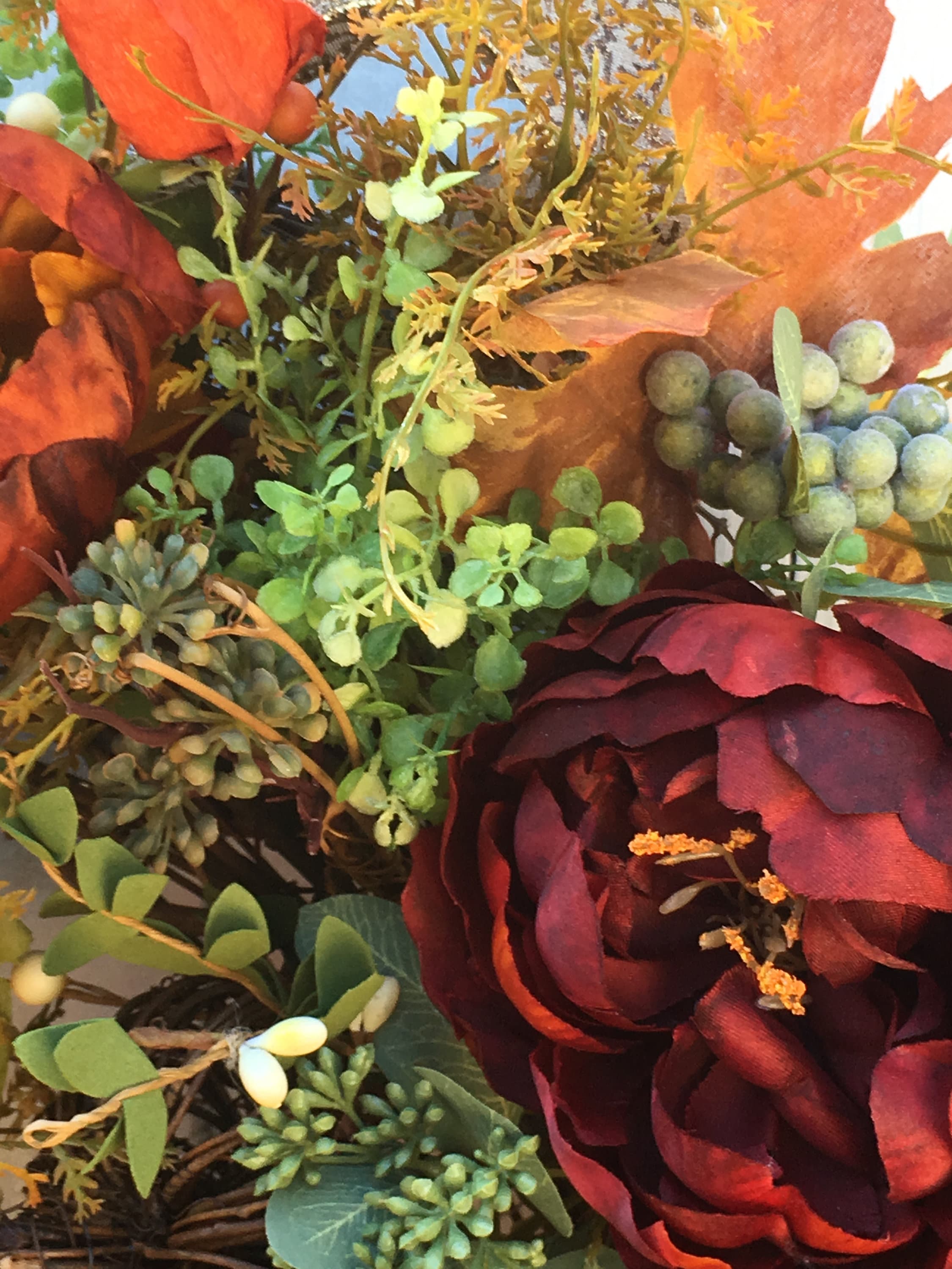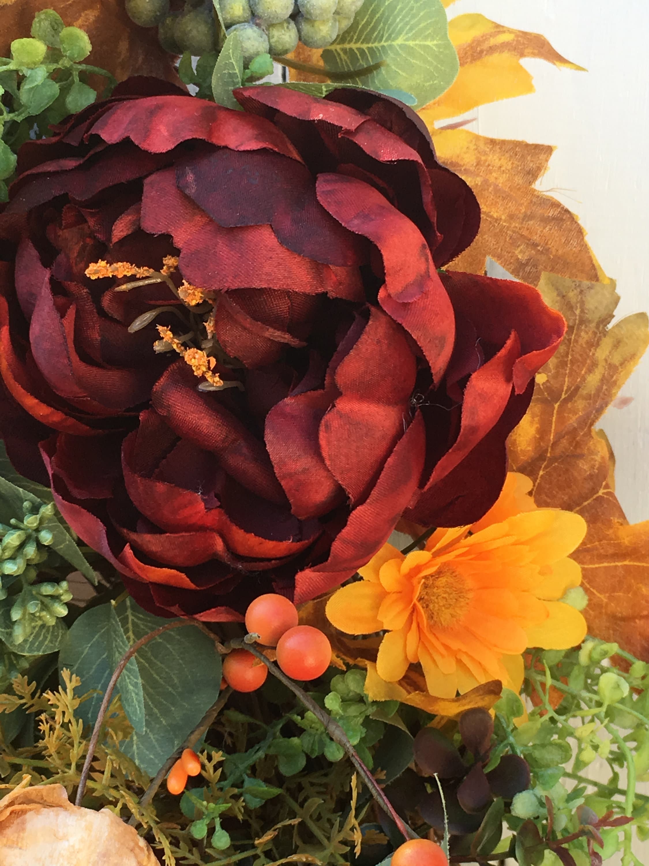 Beautiful for your Fall Decor ,Perfect for Thanksgiving .Elegant Autumn .Who is ready for the phenomenon of Autumn , when the leaves change and have so many hues of red, yellow, orange ,gold, burgandy,purple , magenta, brown , pale and dark shades of green .This Wreath has all of this and more .A 7 inch by 7 inch burlap and wood chip faux pumpkin in the center with grapevine pumpkins adorning this gorgeous wreath. Built on an eightteen inch grapevine wreath form this completed wreath measures 24 inches wide 9 inches deep and 26 inches in height , with ribbon tails extending 12 inches below the wreath . Thank you for visiting our shop .