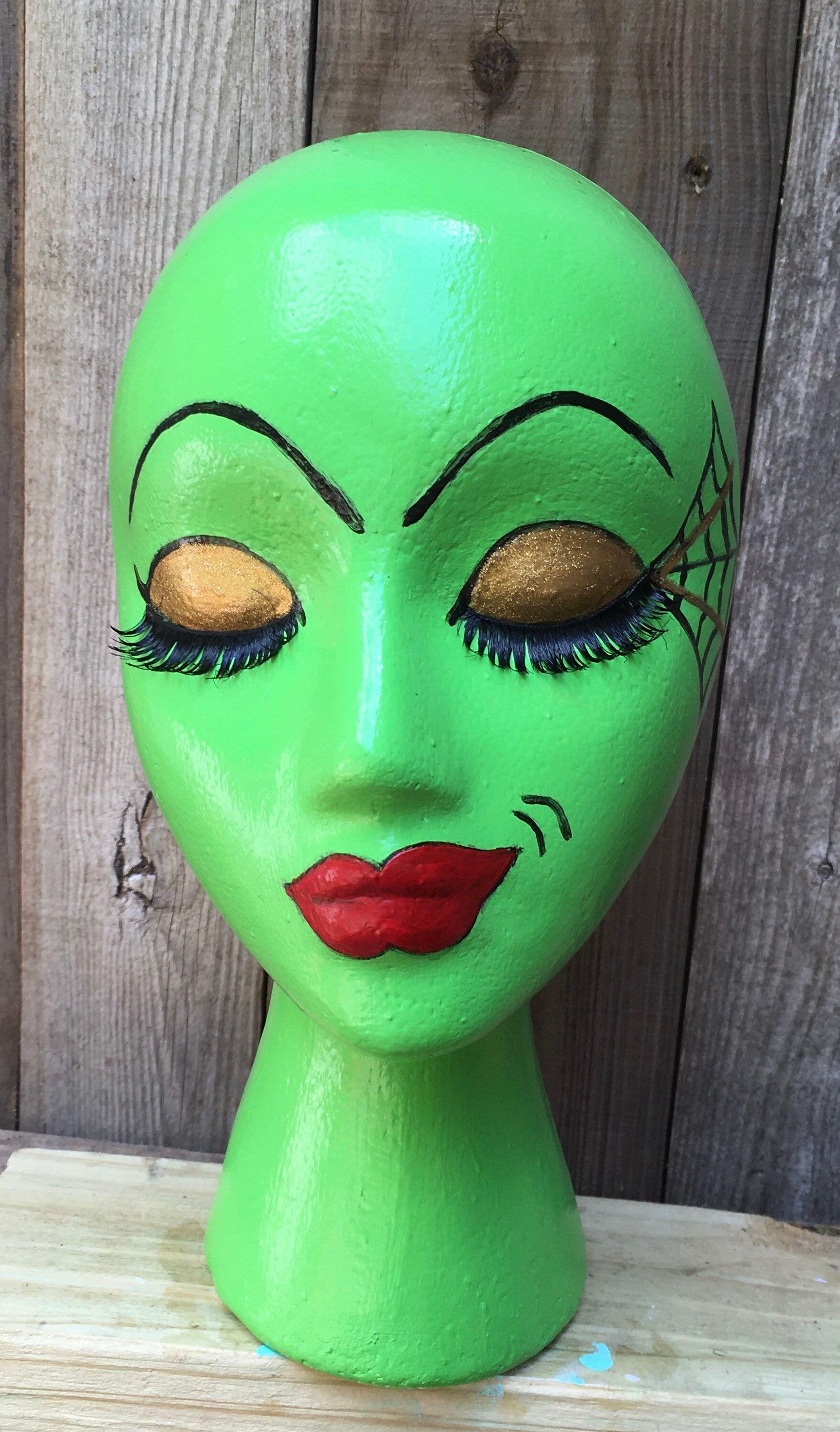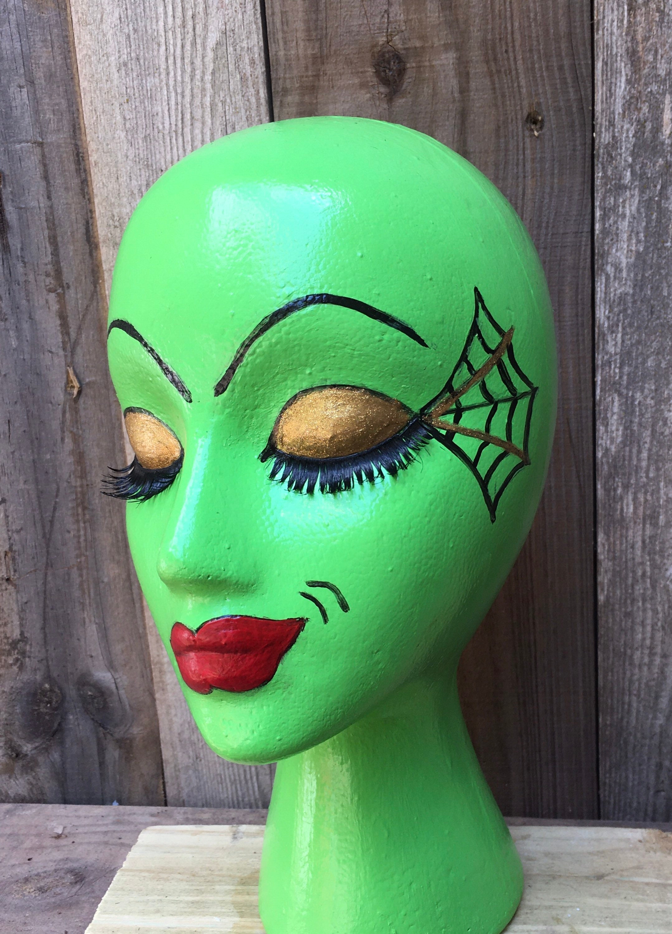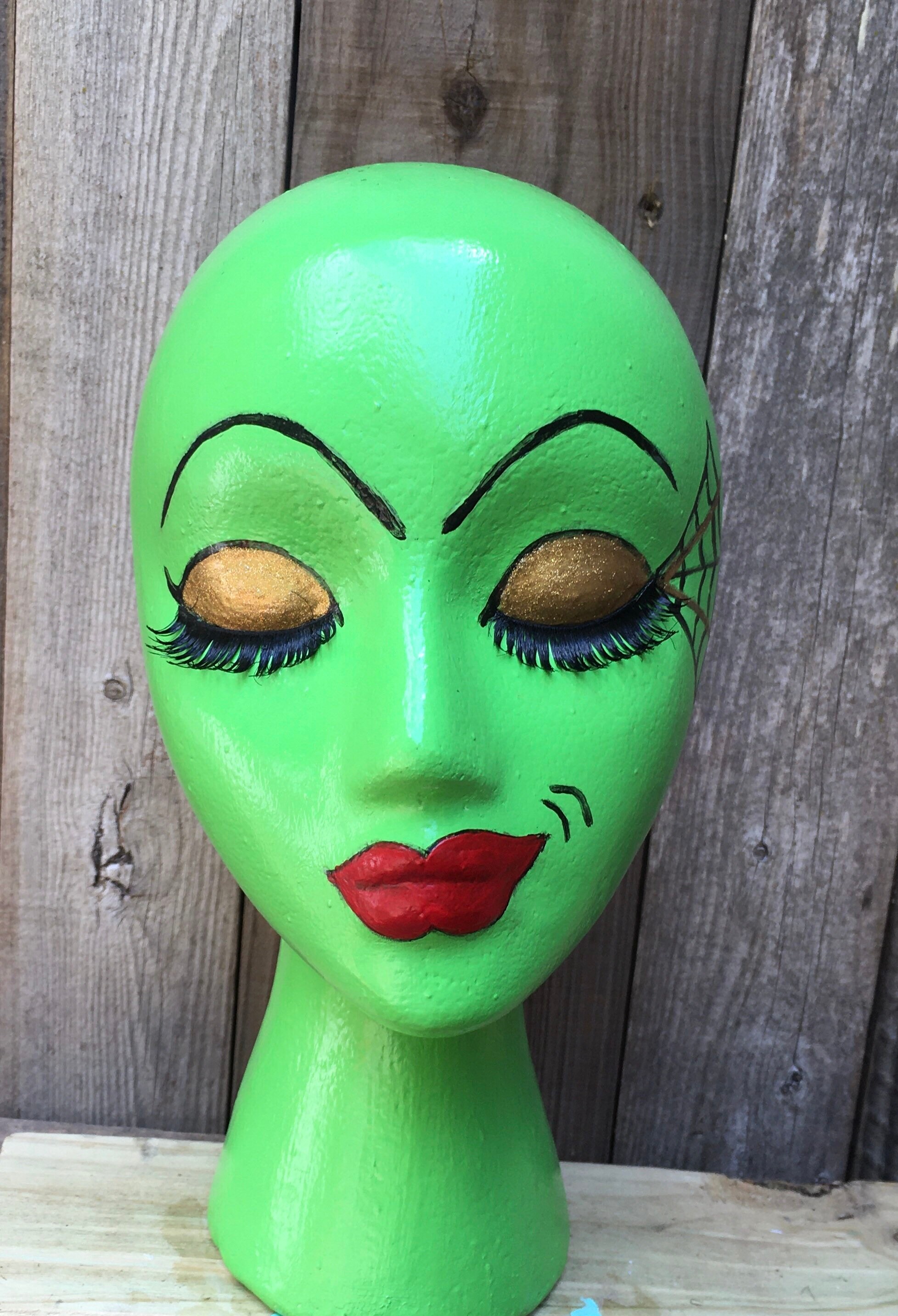 Witch Mannequin head , Painted styrofoam head , glam witch painted mannequin head with gold glitter eyes and long eye lashes and red smirking lips there are endless options to use this embellishment in your Halloween decor .