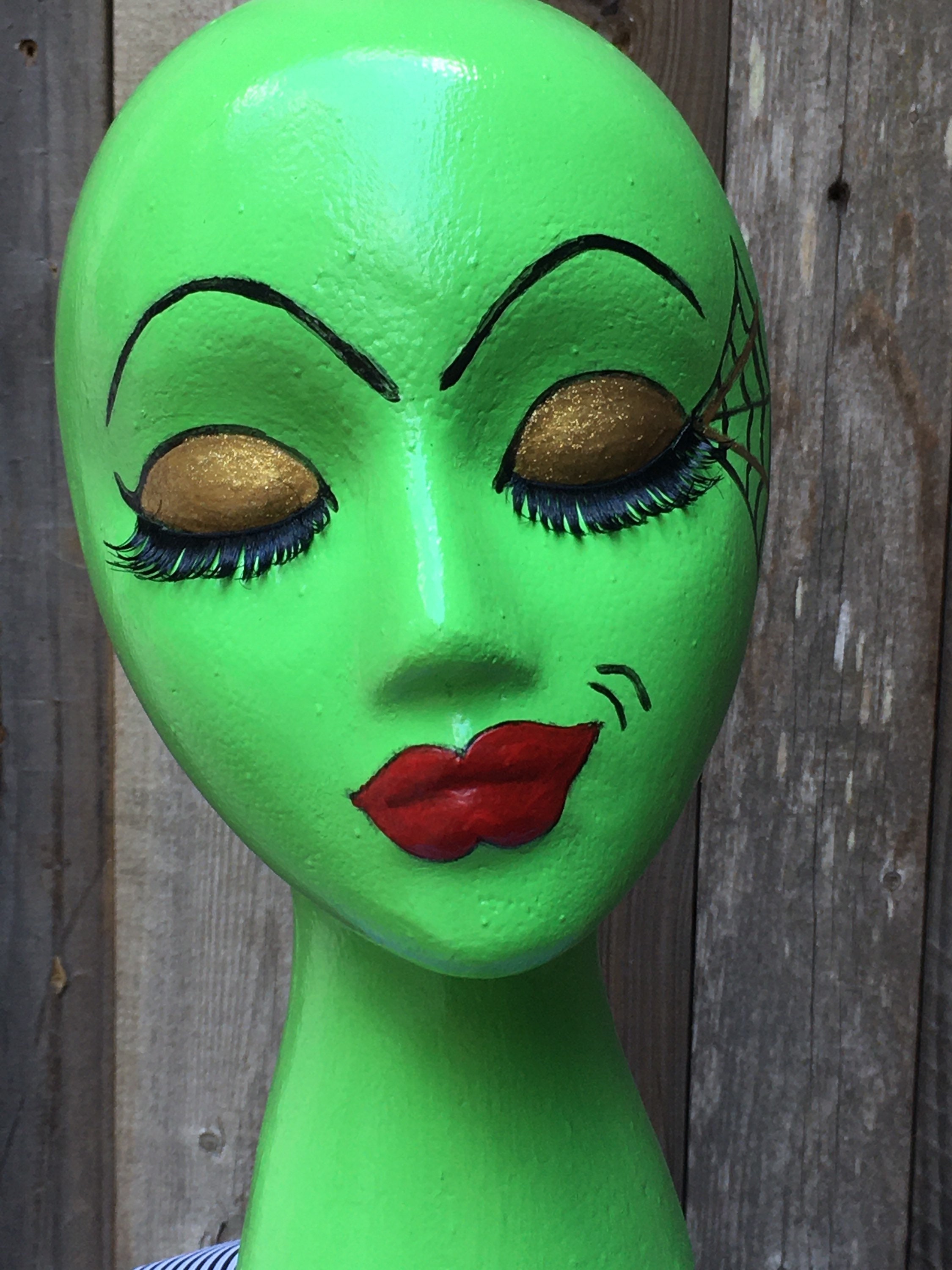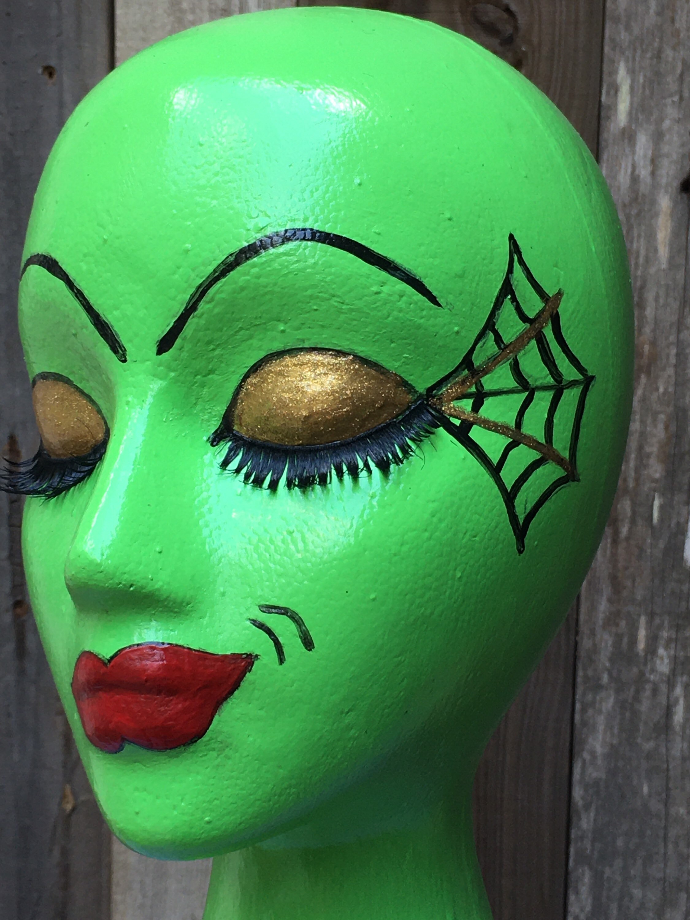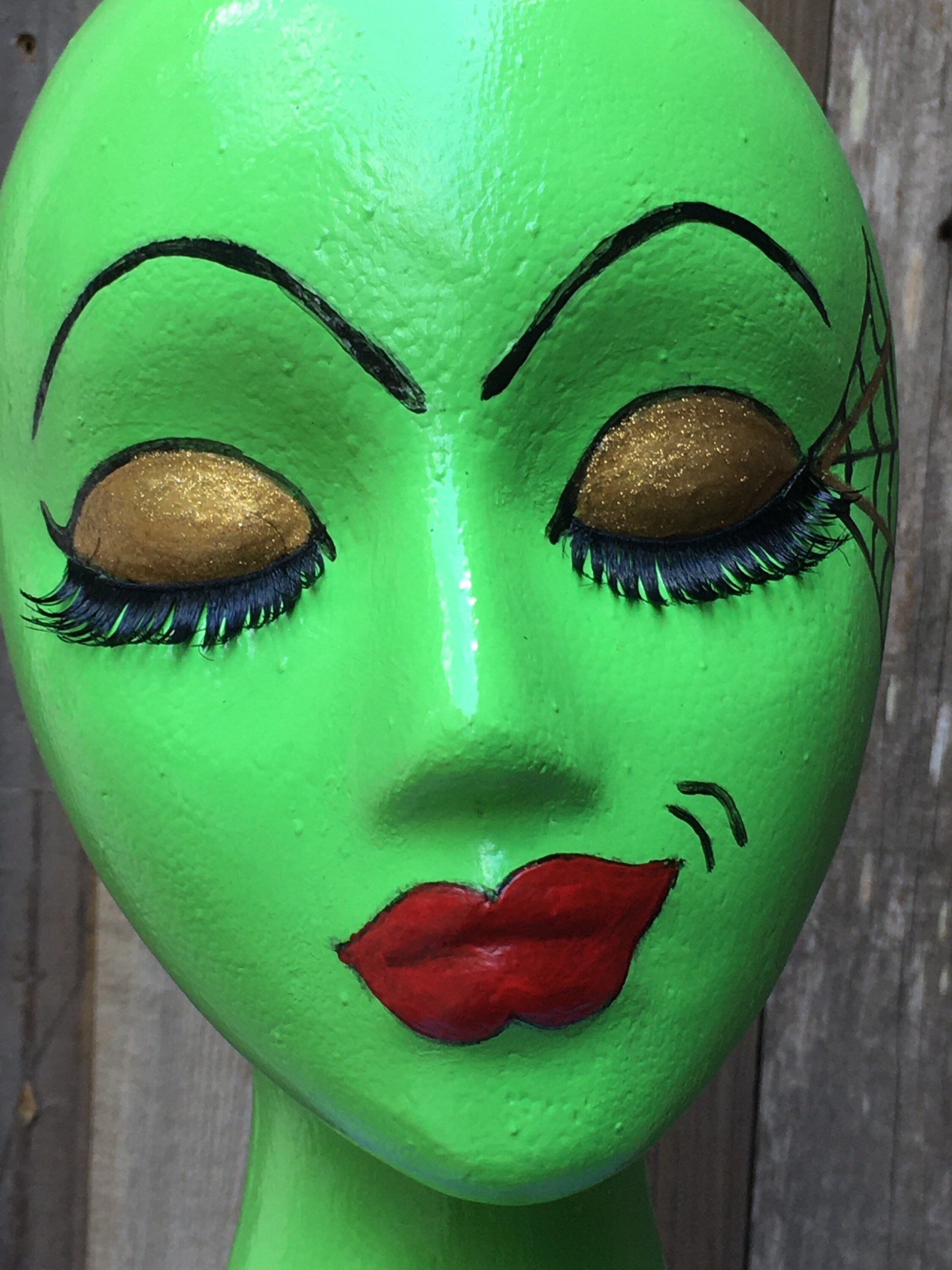Witch Mannequin head , Painted styrofoam head , glam witch painted mannequin head with gold glitter eyes and long eye lashes and red smirking lips there are endless options to use this embellishment in your Halloween decor .