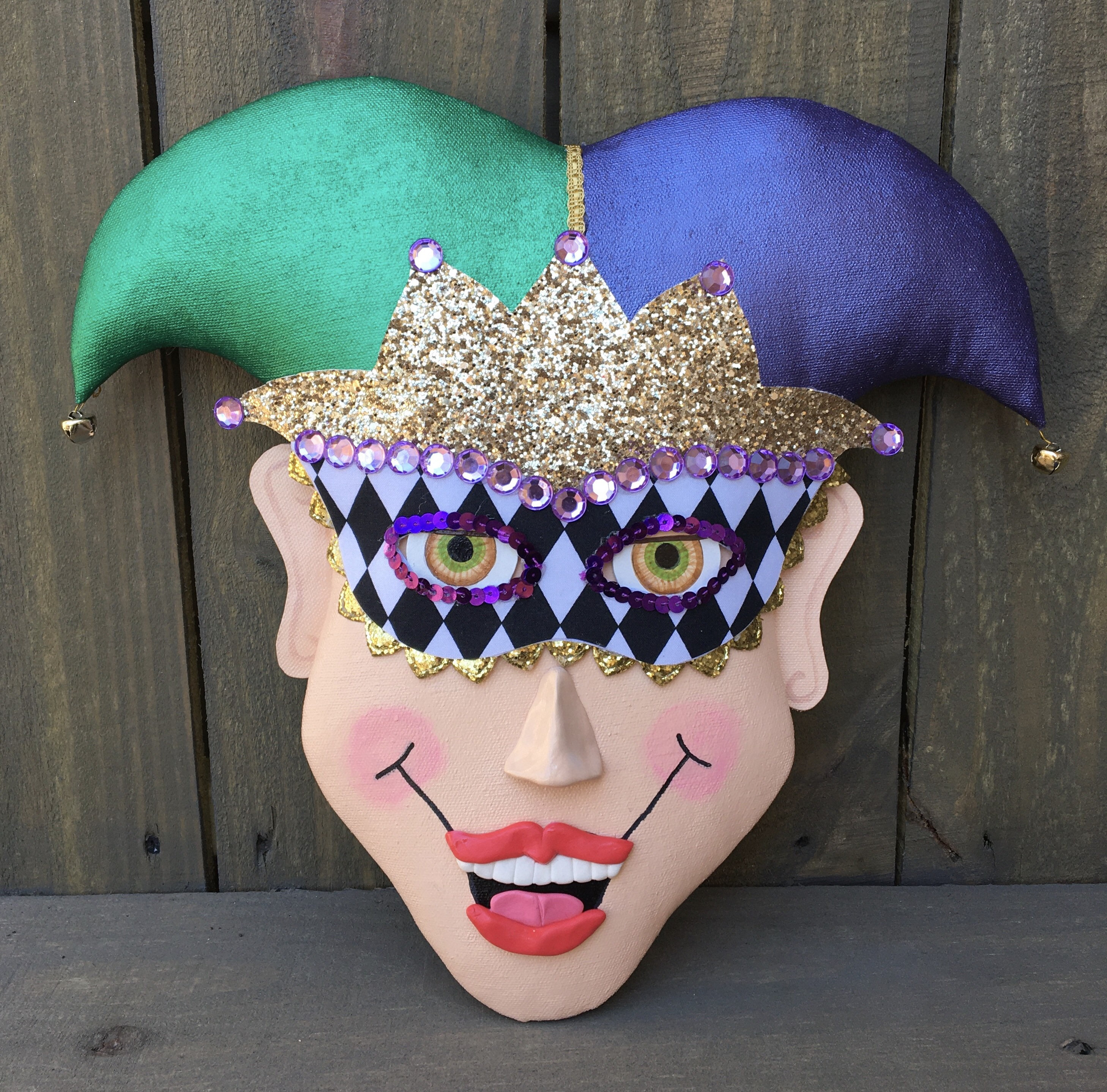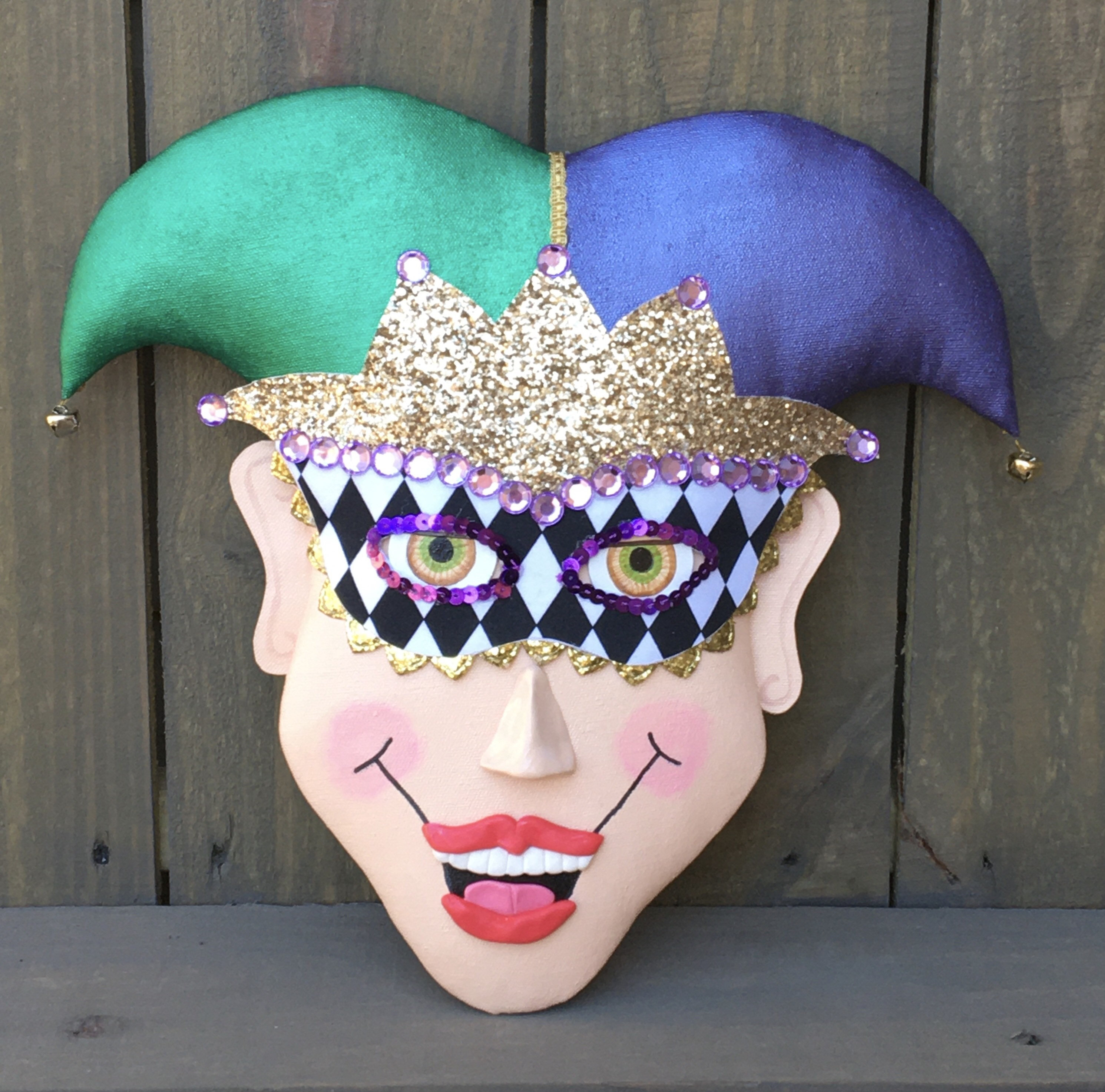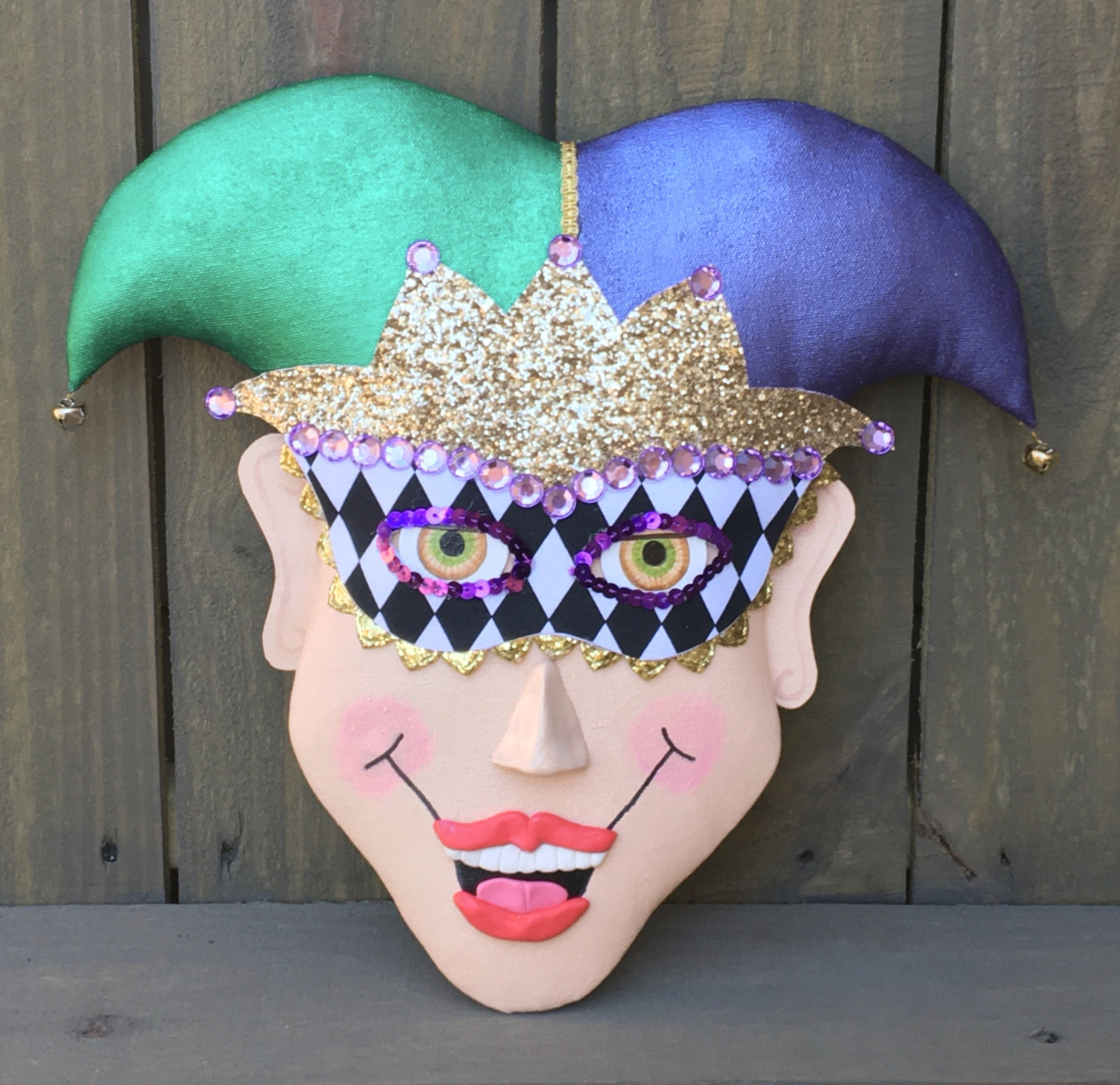 Laissez les bons temps rouler Let the good times roll . This Jester character head will make your Mardi Gras wreath stand out . Easily attaches to wreath or garland . Krewe measures 14 inches wide , 13 inches long and 2.5 inches thick .